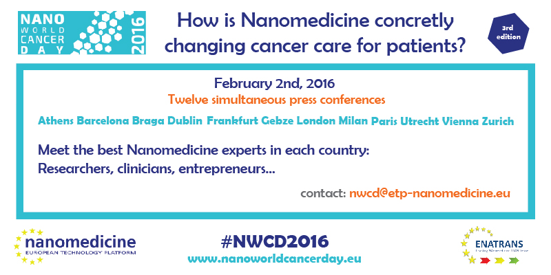 Pressekonferenz zum Nano World Cancer Day 2016 Am 02.02.2016 um 10:30 Uhr CET (+01:00), Frankfurt Nanomedizin bedeutet den Einsatz von Nanotechnologie im Gesundheitswesen. Eines der vielversprechendsten Gebiete ist die Behandlung von Krebserkrankungen; von den rund 200 Nanotechnologie-Produkten, die derzeit in klinischen Studien getestet werden, zielen 31 % auf die Diagnose, Behandlung und das Monitoring von Krebspatienten. Anlässlich des Nano Wold Cancer Day stellt die Deutsche Plattform NanoBioMedizin im Rahmen einer Pressekonferenz interessante und aktuelle Entwicklungen aus dem Bereich der Nanomedizin vor. Die Pressekonferenz ist Teil einer weltweiten Veranstaltungsreihe zum Nano World Cancer Day, an dem seit 2013 jährlich auf die Bedeutung der Nanomedizin für die Krebsbehandlung aufmerksam gemacht wird. Ihre Gesprächspartner sind: Nanomedizin für Deutschland und Europa Dr. Klaus Michael Weltring Geschäftsführer der Gesellschaft für Bioanalytik e.V. und Sprecher der Deutschen Plattform NanoBioMedizin Herausforderungen und Möglichkeiten in der modernen Krebstherapie Prof. Dr. med. Christof von Kalle Direktor für Translationale Onkologie, Nationales Centrum für Tumorerkrankungen (NCT) Heidelberg und Deutsches Krebsforschungszentrum (DKFZ) Heidelberg Krebsimmuntherapie von morgen: Inhalieren statt Spritzen? Dr. Andrea Hanefeld Director, Head Search Evaluation Pharmaceutical and Early Development Technologies Biopharma | External Innovation, Merck KGaA, Darmstadt Phospholipide als etablierte Nanomaterialien in der Krebs Nanomedizin PD Dr. Peter van Hoogevest Head of Scientific Department, Lipoid GmbH, Ludwigshafen ENATRANS – Europäische Unterstützungsmaßnahme für den nanomedizinischen Sektor Dr. Nicolas Gouze ENATRANS Koordinator und ETPN Secretariat, VDI/VDE Innovation + Technik GmbH, Berlin Die Anmeldung ist ab sofort möglich. Bitte alle mit einem Sternchen versehene Pflichtfelder ausfüllen! * Bitte beachten: Die mit einem Sternchen versehenen Felder sind Pflichtangaben. |