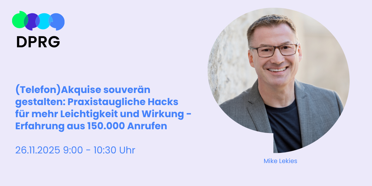 | DPRG Deutsche Public Relations Gesellschaft e.V. Veranstaltung am 26.11.2025: (Telefon)Akquise souverän gestalten: Praxistaugliche Hacks für mehr Leichtigkeit und Wirkung - Erfahrung aus 150.000 AnrufenAm 26.11.2025 um 09:00 Uhr CET (+01:00), MS-Teams Bis 26.11.2025 um 10:30 Uhr CET (+01:00) Akquisition ist für die meisten PR-Unternehmerinnen und -Unternehmer unverzichtbar, denn sie sorgt für Wachstum, Sichtbarkeit und nicht zuletzt für das tägliche Einkommen. Und trotzdem tun sich viele Kommunikatoren schwer damit. Akquise wird schnell als aufdringlich empfunden, während das Tagesgeschäft die volle Aufmerksamkeit fordert. Doch wer sie als Teil der eigenen Kommunikationsstrategie begreift, kann daraus eine authentische und wirkungsvolle Routine entwickeln. Ansprechpartner*in