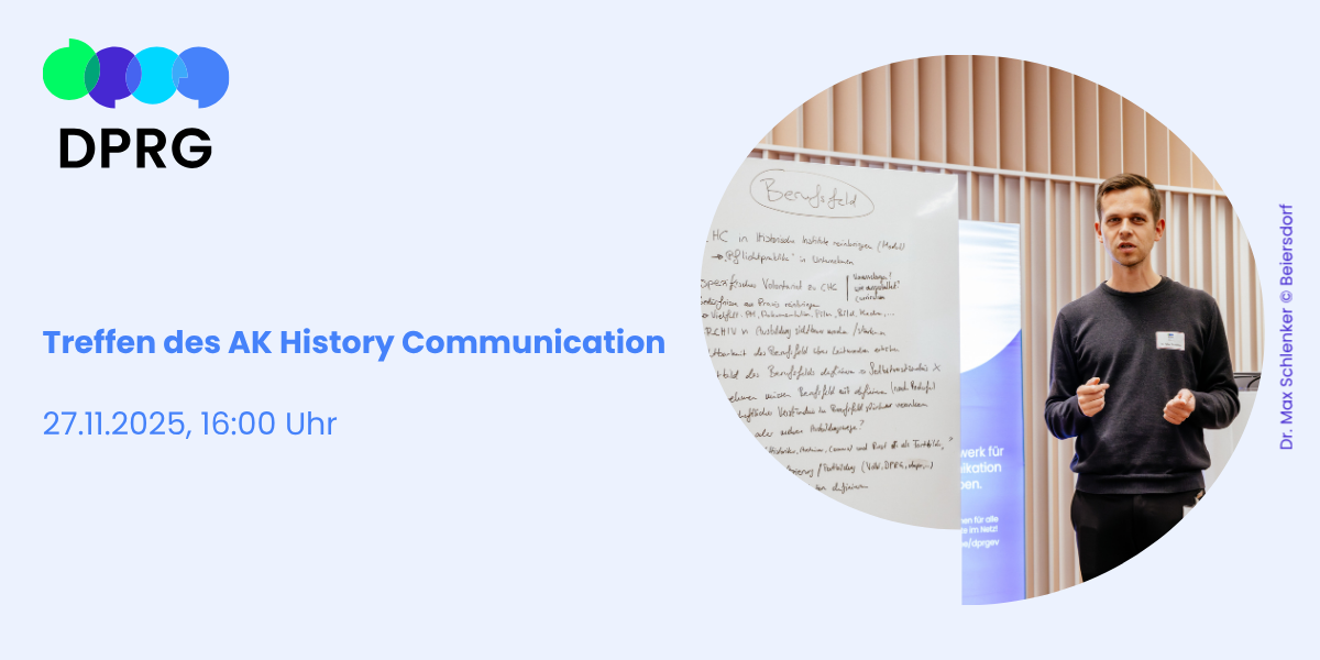 | DPRG Deutsche Public Relations Gesellschaft e.V. Treffen des AK History Communication am 27.11.2025Am 27.11.2025 um 16:00 Uhr CET (+01:00), MS-Teams Bis 27.11.2025 um 17:00 Uhr CET (+01:00) Ein Jahr, viele Impulse. Zum Jahresabschluss wollen wir gemeinsam nach vorn schauen. Welche Aufgaben ergeben sich aus dem Positionspapier? Und welche Themen treiben wir 2026 voran? Freut euch auf eine interaktive Session mit Raum für Austausch und Ideen. Ansprechpartner*in
