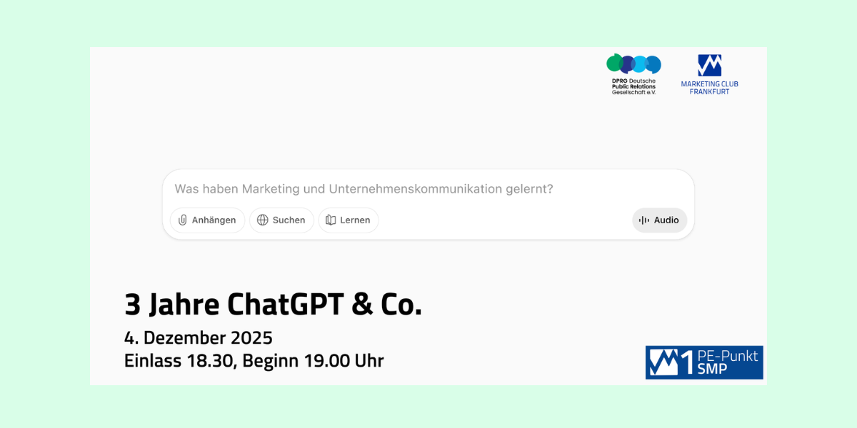 | DPRG Deutsche Public Relations Gesellschaft e.V. Veranstaltung am 4.12.2025: 3 Jahre ChatGPT & Co. – Was Marketing und Unternehmenskommunikation gelernt habenAm 04.12.2025 um 18:30 Uhr CET (+01:00), Script Communications Bis 04.12.2025 um 21:00 Uhr CET (+01:00) Drei Jahre nach der Veröffentlichung von ChatGPT blicken die DPRG Landesgruppe Hessen, Rheinland-Pfalz, Saarland und der Marketing Club Frankfurt in ihrer ersten gemeinsamen Veranstaltung darauf, was sich in Marketing und Unternehmenskommunikation verändert hat – und sich noch verändern wird. Ansprechpartner*in