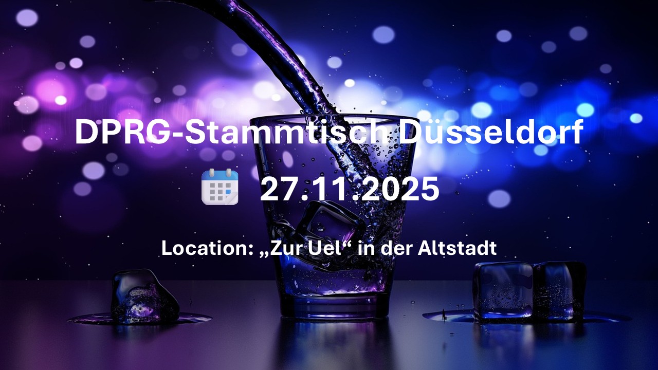 | DPRG Deutsche Public Relations Gesellschaft e.V. Stammtisch in Düsseldorf am 27.11.2025Am 27.11.2025 um 19:00 Uhr CET (+01:00), Gasthaus "Zur Uel" Bis 27.11.2025 um 21:00 Uhr CET (+01:00) Seid dabei! Zum Jahresabschluss freuen wir uns, euch beim Stammtisch in Düsseldorf zu begrüßen. Wir blicken zurück auf das Jahr 2025 und diskutieren die Themen der Zeit – auf Stammtischniveau. Ansprechpartner*in