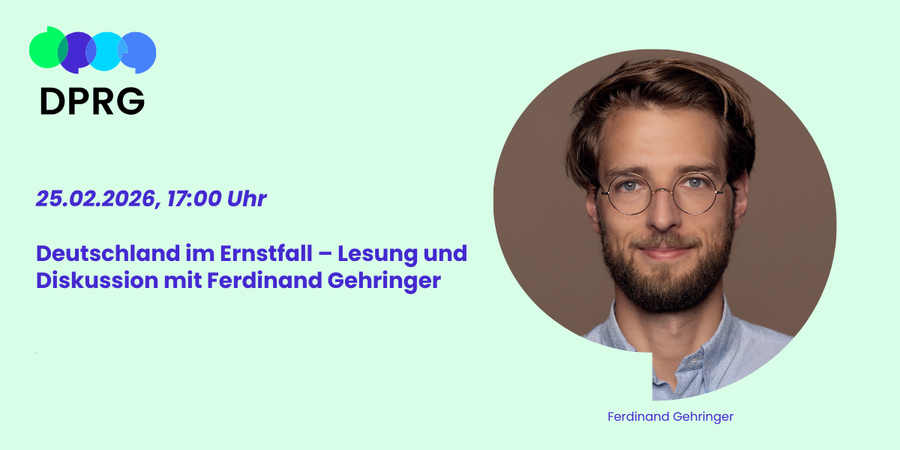 | DPRG Deutsche Public Relations Gesellschaft e.V. Einladung zur Lesung und Diskussion am 25.02.2026 mit Ferdinand Gehringer: Deutschland im ErnstfallAm 25.02.2026 um 17:00 Uhr CET (+01:00), Online Bis 25.02.2026 um 18:30 Uhr CET (+01:00) Wir wollen im Netzwerk sicherheitspolitische Kommunikation die Themen Sicherheit und Resilienz weiter vertiefen. Wir freuen uns daher sehr, auf unseren Gast Ferdinand Gehringer, Co-Autor des Buches „Deutschland im Ernstfall“. Ansprechpartner*in