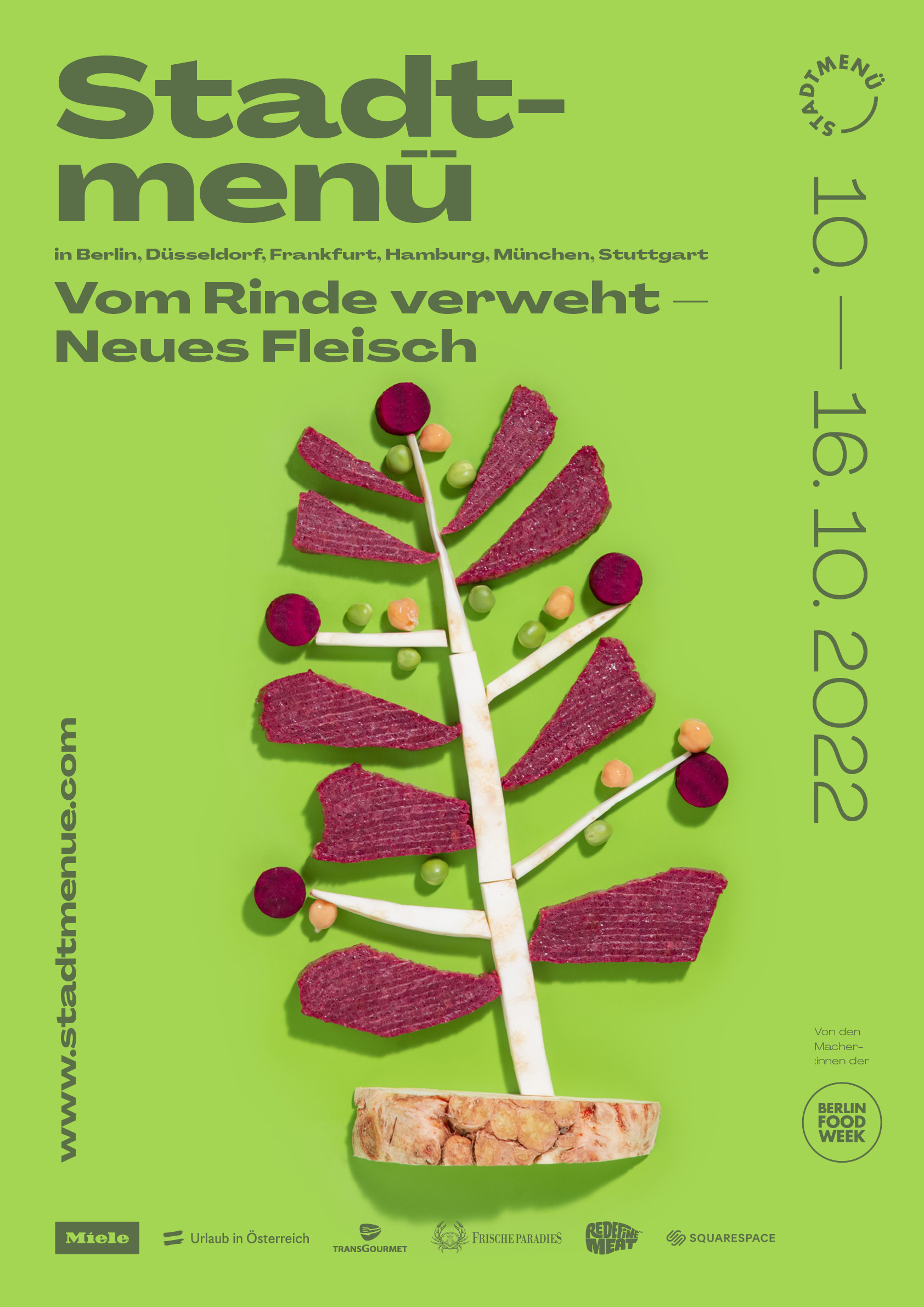 Foodmetropole zu präsentieren sowie in der deutschen Öffentlichkeit das Bewusstsein für gesunde Ernährung und die Qualität von Nahrungsmitteln zu verstärken. In 2019 expandierte die Berlin Food Week mit dem Format Stadtmenü erstmals in weitere deutsche Städte, im Jahr 2020 legte das Festival eine Corona-bedingte Pause ein. Im Jahr 2021 stand das Food-Festival deutschlandweit unter dem Motto “Eine kulinarische Klimakampagne”.