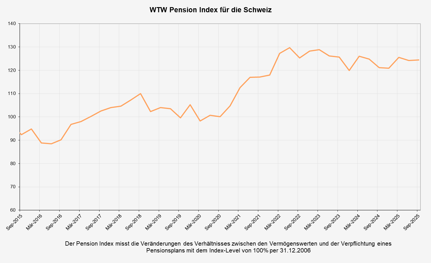 Retirement Consulting bei WTW in Zürich. Er ergänzt: «Die Pensionspositionen in den Bilanzen Schweizer Unternehmen blieben im dritten Quartal im Durchschnitt stabil, während die Pensionskassen weiterhin über solide finanzielle Grundlagen verfügten.»