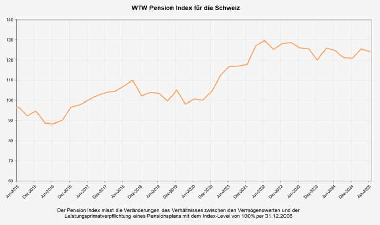 Die Vermögenswerte blieben im zweiten Quartal 2025 weitgehend unverändert, während die Verpflichtungen aufgrund der leicht sinkenden Diskontierungssätze um 1,0 % zunahmen. Folglich verschlechterte sich der Deckungsgrad (d. h. das Verhältnis von Pensionsvermögen zu Pensionsverpflichtungen) im zweiten Quartal um 1,3%, wie aus dem WTW Pension Index hervorgeht. Er sank von 125,5 % per 31. März 2025 auf 124,2 % per 30. Juni 2025.
