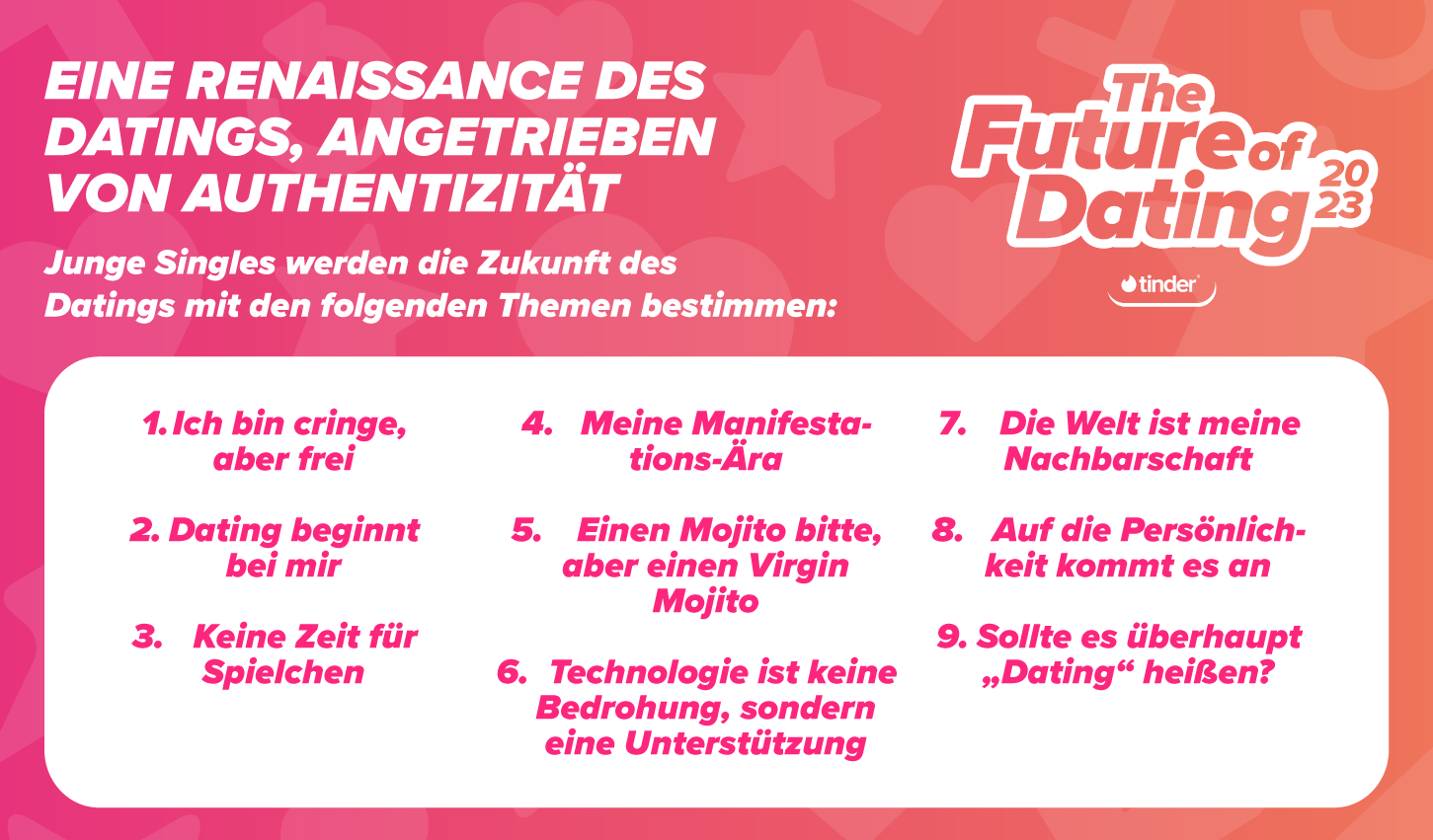 Tinders Future Of Dating Report 2023 „Eine Renaissance des Datings, angeführt von Authentizität“: Der zweite Trend-Report der weltweit beliebtesten Dating-App. Der Report stützt sich auf Daten der App sowie auf Umfragen unter 18- bis 25-Jährigen und 33- bis 38-Jährigen in Großbritannien, den USA, Kanada und Australien.