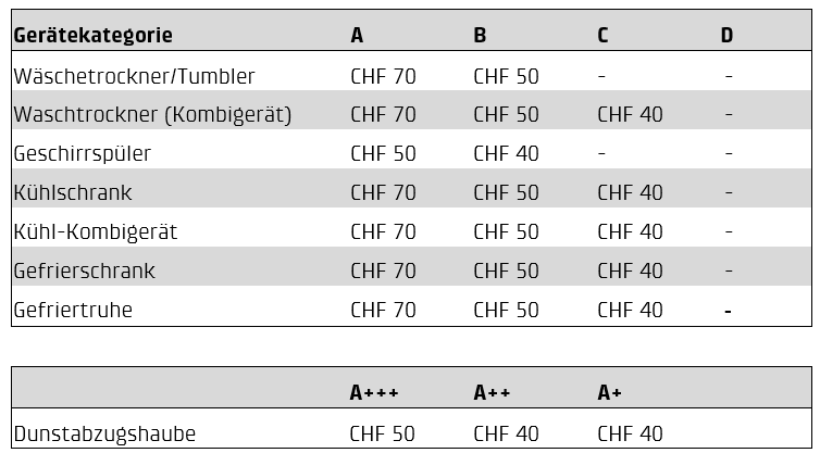 Die Fördersätze pro Gerätekategorie sind die folgenden: |