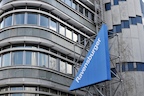 Das blaue Dreieck, Markenzeichen von Ravensburger, am Firmengebäude der Unternehmensgruppe in Ravensburg.