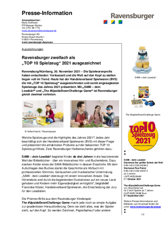 Ravensburg/Nürnberg, 30. November 2021 – Die Spielwarenprofis haben entschieden: Vorlesezeit und die Welt auf den Kopf zu stellen liegen voll im Trend. Heute hat der Handelsverband Spielwaren (BVS) die mit „TOP 10 Spielzeug“ ausgezeichneten und somit angesagtesten Spielzeuge des Jahres 2021 präsentiert. Mit "SAMi – dein Lesebär!" und "The #UpsideDownChallenge Game" ist Ravensburger gleich zweimal vertreten. weiterlesen…