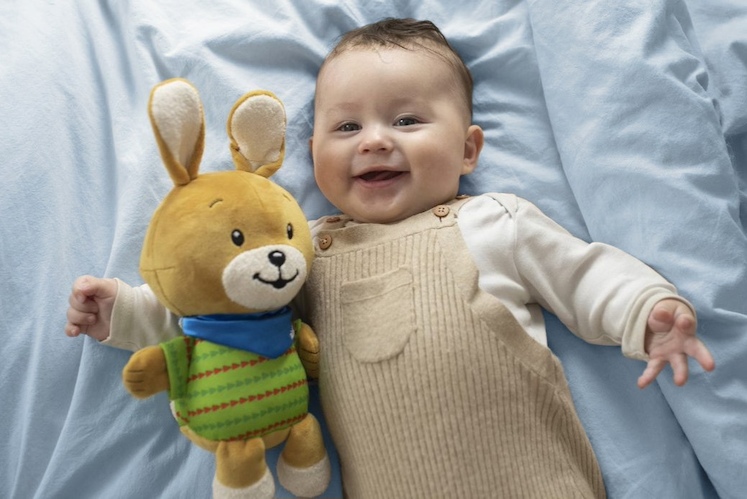 Spielszene ministeps Kuschelfreund Hase mit Junge im Bettchen