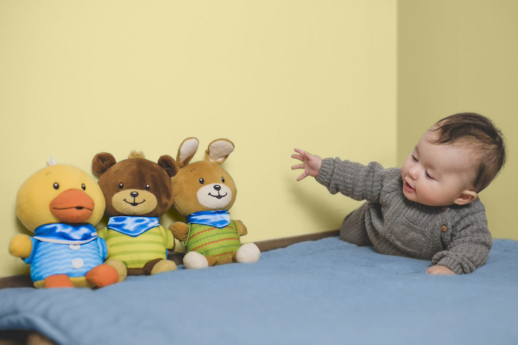 Spielszene Junge präsentiert drei ministeps Kuschelfreunde