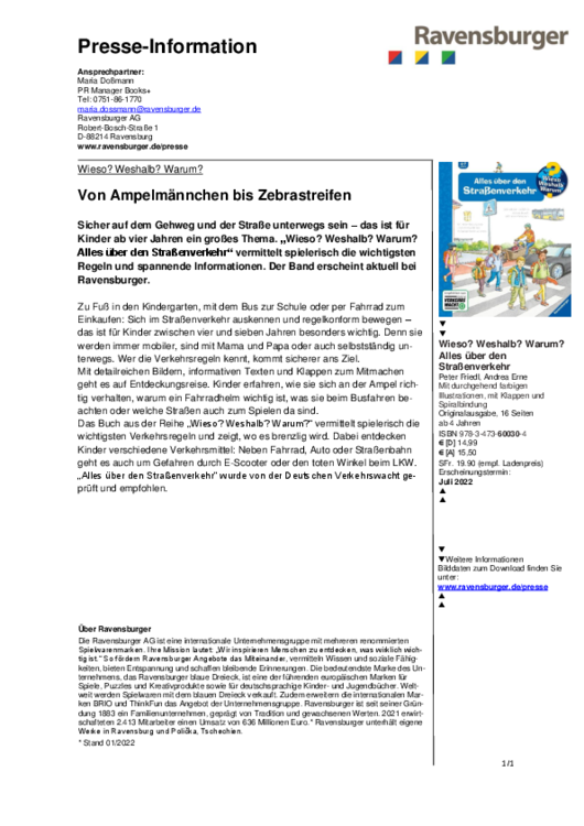 Sicher auf dem Gehweg und der Straße unterwegs sein – das ist für Kinder ab vier Jahren ein großes Thema. „Wieso? Weshalb? Warum? Alles über den Straßenverkehr“ vermittelt spielerisch die wichtigsten Regeln und spannende Informationen. Der Band erscheint aktuell bei Ravensburger. weiterlesen…