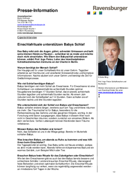 Ravensburg/Berlin: Das Baby reibt sich die Augen, gähnt, schneidet Grimassen und ballt seine kleinen Hände zu Fäusten – scheinbar ist es müde und möchte doch nicht einschlafen. Wie Eltern den Babyschlaf unterstützen können erklärt Prof. Ingo Fietze, Leiter des Interdisziplinären Schlafmedizinischen Zentrums an der Charité in Berlin. weiterlesen…