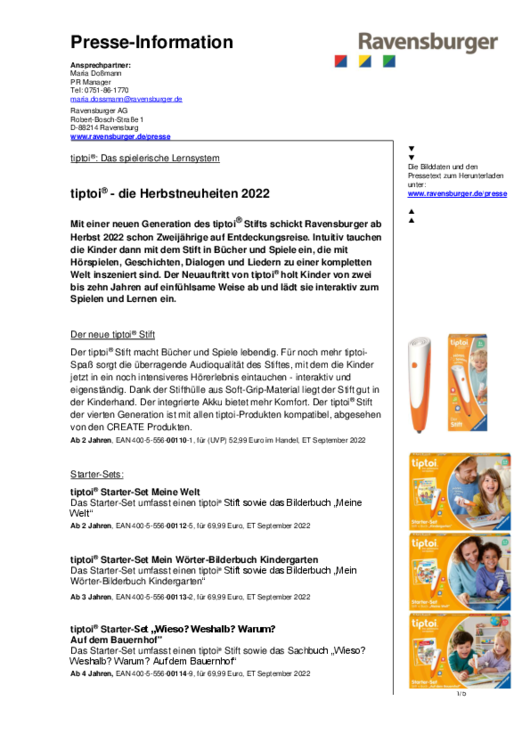 Mit einer neuen Generation des tiptoi® Stifts schickt Ravensburger ab Herbst 2022 schon Zweijährige auf Entdeckungsreise. Intuitiv tauchen die Kinder dann mit dem Stift in Bücher und Spiele ein, die mit Hörspielen, Geschichten, Dialogen und Liedern zu einer kompletten Welt inszeniert sind. Der Neuauftritt von tiptoi® holt Kinder von zwei bis zehn Jahren auf einfühlsame Weise ab und lädt sie interaktiv zum Spielen und Lernen ein. weiterlesen…