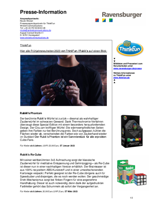 Übersicht > Bild- und Audiomaterial > Dokumente > PM_ThinkFun_Neuheiten 2023 Frühjahr PM_ThinkFun_Neuheiten 2023 Frühjahr Veröffentlicht am: 11.01.2023 Typ: PDF Größe: 310.97 KB dazugehörige Pressemitteilungen Frühjahrsneuheiten 2023 von ThinkFun / Rubik’s auf einen Blick weiterlesen… 11.01.2023 | Thinkfun, Rubik's, Rubik's Cube, Denk- und Logikspiel, Brain- and Logic Games, Brainteaser, Logikspiel | Thema: ThinkFun Originaldatei herunterladen Teilen