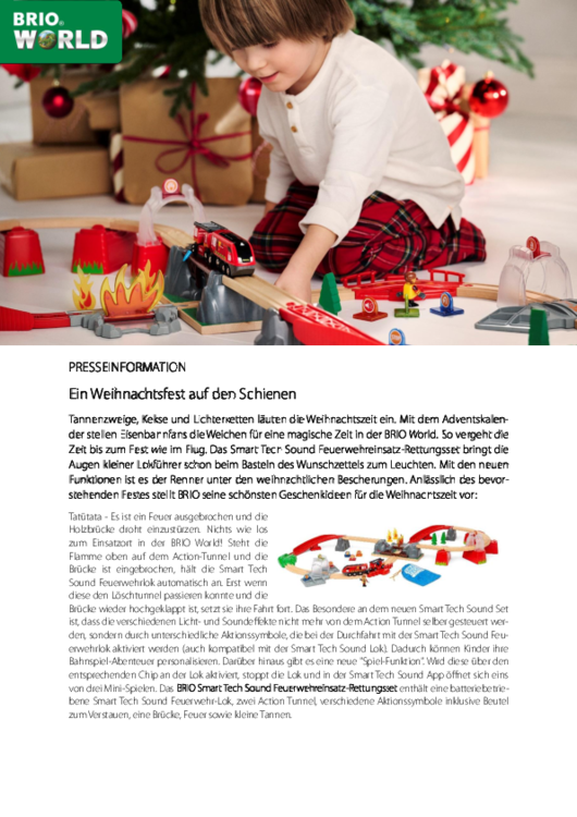 Übersicht > Bild- und Audiomaterial > Dokumente > PM_BRIO_Weihnachtsmeldung PM_BRIO_Weihnachtsmeldung Veröffentlicht am: 04.08.2023 Typ: PDF Größe: 299.16 KB dazugehörige Pressemitteilungen Ein Weihnachtsfest auf den BRIO Schienen weiterlesen… 02.11.2023 | BRIO, BRIO World, Weihnachten | Thema: BRIO Originaldatei herunterladen Teilen