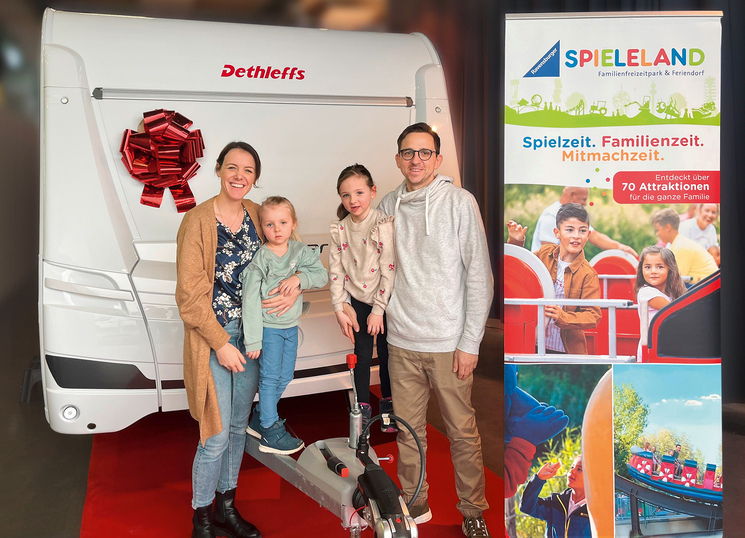 Familie Radina freut sich über ihren neuen Dethleffs Camper, den Hauptgewinn des Jahresgewinnspiels 2023 im Ravensburger Spieleland.