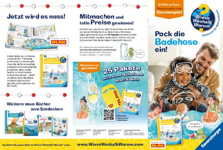 Kinder lieben Schwimmen und für sie ist das ganze Jahr Badesaison – egal ob im Hallenbad, im Freibad, im Badesee oder am Meer. Doch Sicherheit sollte an erster Stelle stehen. Warum kann Baden in unbekannten Gewässern gefährlich sein? Was muss am Meer beachtet werden? Was wird eigentlich im Schwimmkurs geübt? Diese und viele andere Fragen beantwortet das neue Kindersachbuch „Komm mit zum Schwimmen“ aus der beliebten Wissensreihe „Wieso? Weshalb? Warum?“ von Ravensburger. Das Besondere: Es wurde in enger Abstimmung mit Ausbildungsexperten der Deutschen Lebens-Rettungs-Gesellschaft e.V. (DLRG) konzipiert, entwickelt und umgesetzt. Auf insgesamt 16 bunt illustrierten Seiten laden zahlreiche Klappen zum Entdecken ein. Sie veranschaulichen beispielsweise Schwimmbewegungen oder liefern ergänzende Informationen. So wird die Neugierde und Freude auf den ersten Schwimmkurs geweckt. Das Sachbuch für Kinder von vier bis sieben Jahren enthält auch die zehn wichtigsten Baderegeln, die alle im und am Wasser kennen und beachten sollten. weiterlesen…