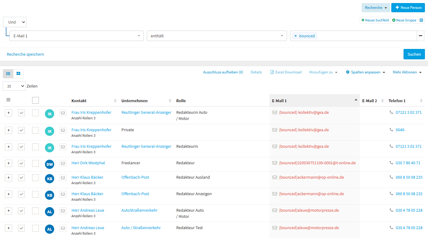 Recherchen können Ihnen zudem helfen herauszufinden, welche Kontakte nicht angeschrieben werden können, weil keine E-Mail Adressen vorhanden sind: