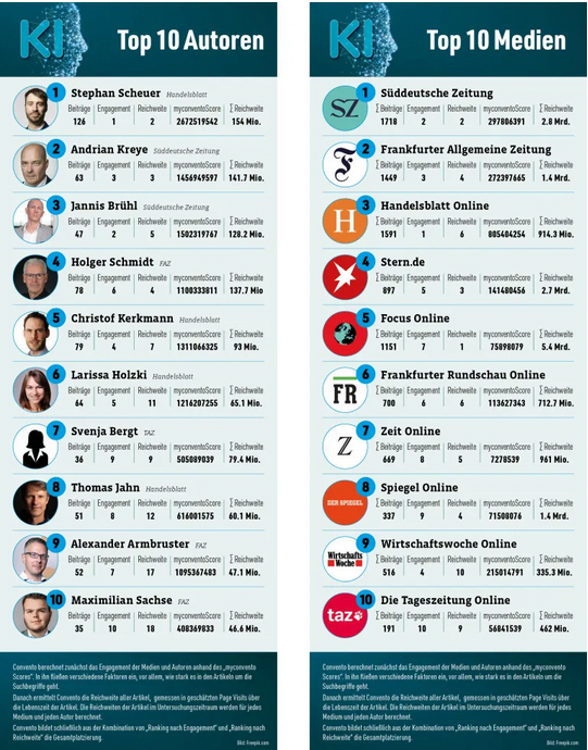 Mit diesen Erkenntnissen erstellten wir eine „Hitliste“ der einflussreichsten Journalist:innen und Medien, die in den letzten 12 Monaten über Künstliche Intelligenz berichtet hatten. Diese Hitliste wurde später im prmagazin veröffentlicht und ist ein wertvoller Beitrag zur Medienbeobachtung und -analyse im Bereich der Technologieberichterstattung. Die vollständige Zusammenfassung der Ergebnisse ist unter diesem Link verfügbar: prmagazin.de/die-top-10-2.